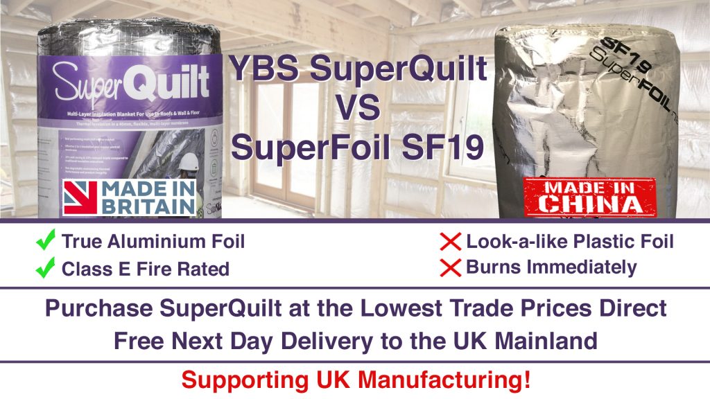 Many people get confused between SuperFoil and SuperQuilt – although there are distinct differences – SuperQuilt is Manufactured here in the UK, using True Aluminium Foil, whereas SuperFoil is manufactured in China using a lookalike plastic foil.